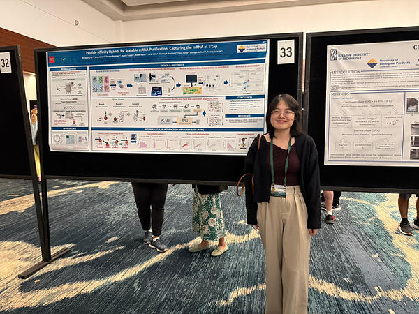 Dr. Hu, Postdoctoral Researcher, presented her work on “Peptide Affinity Ligands for Scalable mRNA Purification: Capturing the mRNA 5’ Cap.” This research introduces novel peptide ligands designed to enhance recovery and selectivity in therapeutic mRNA purification. -